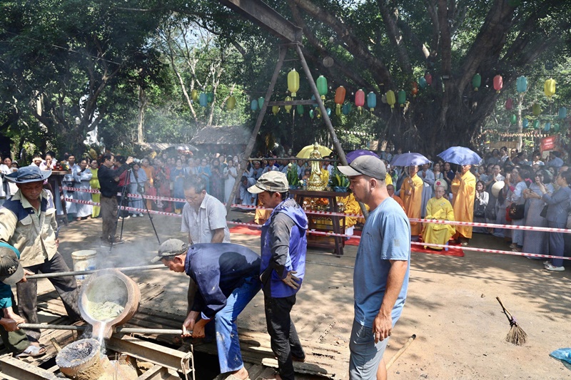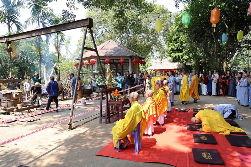 Trong không gian tâm linh trang nghiêm, thanh tịnh của Phật đường Pô Lăn, Chư tôn đức chứng minh niêm hương bạch Phật, cử hành nghi thức chú nguyện đúc chuông Đại Hồng trong tiếng hộ niệm của toàn thể đại chúng, góp phần mang lại nguồn năng lượng an lành và thành tựu cho buổi lễ.