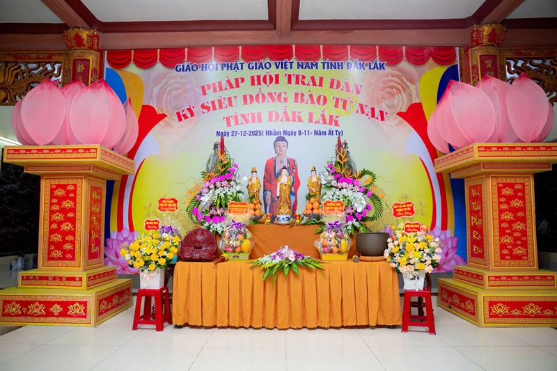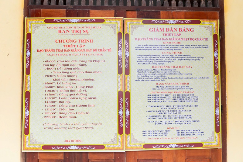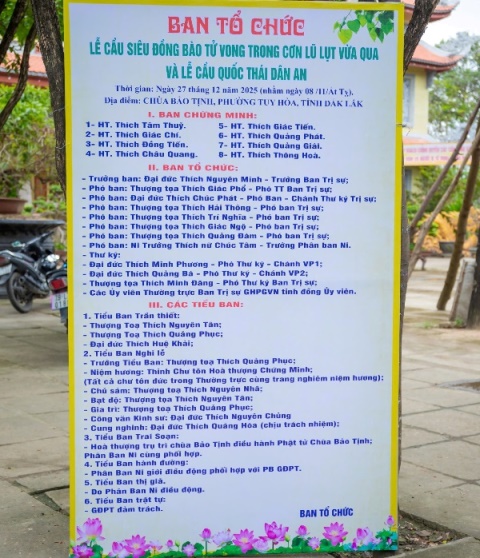 Ngày 26/12/2025 công tác chuẩn bị cho Đại lễ cầu siêu các nạn nhân tử vong do bão lũ được Ban Trị sự Giáo hội Phật giáo Việt Nam (GHPGVN) tỉnh Đắk Lắk tổ chức tại chùa Bảo Tịnh cơ bản đã hoàn thành, sẵn sàng cho lễ chính thức vào ngày mai, 27/12/2025.Tại chùa Bảo Tịnh (phường Tuy Hoà) – Văn phòng Thường trực Ban Trị sự GHPGVN tỉnh Đắk Lắk là nơi diễn ra Đại Lễ – công tác chuẩn bị đã hoàn tất với các khâu thiết trí đàn cầu siêu, trang trí cờ, băng-rôn và các lễ tiết khác đã được sắp xếp ổn định, chu đáo.