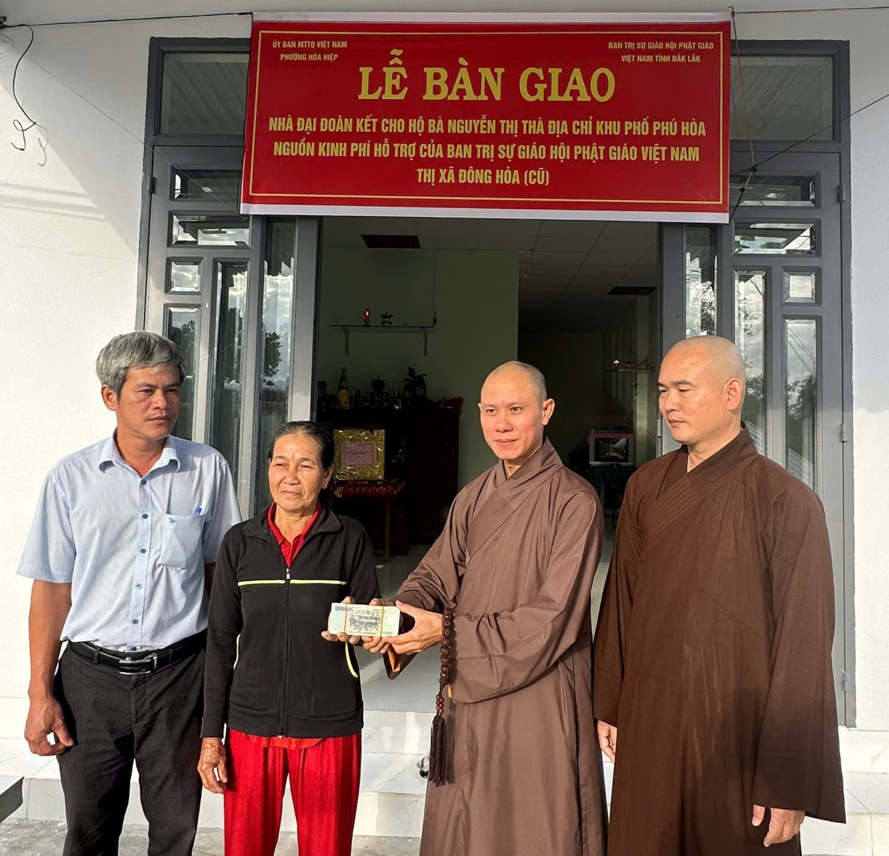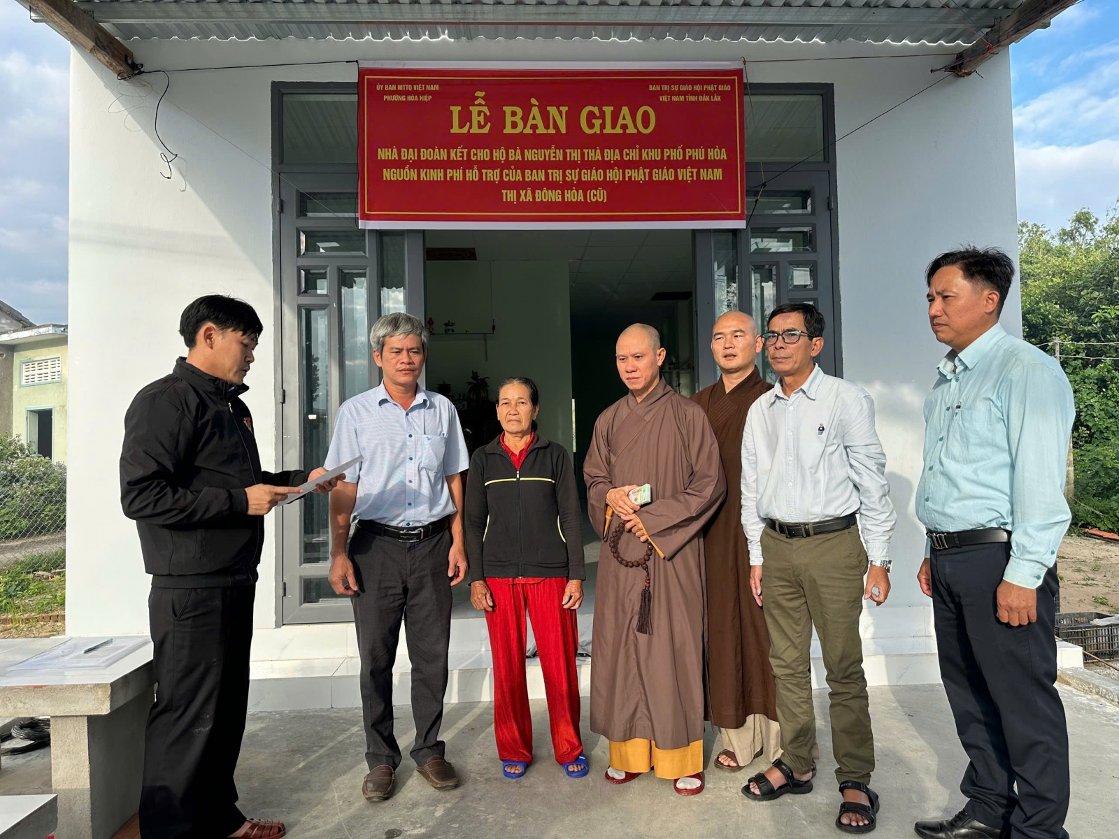 Chiều ngày 31/12/2025, tại Khu phố Phú Hoà, phường Hoà Hiệp, tỉnh Đắk Lắk, đại đức Thích Nguyên Minh, Trưởng Ban Trị sự giáo hội Phật giáo Việt Nam tỉnh Đắk Lắk phối hợp cùng UBMTTQVN phường tổ chức Lễ bàn giao nhà Đại đoàn kết cho bà Nguyễn Thị Thà, là hộ gia đình có hoàn cảnh khó khăn trên địa bàn.