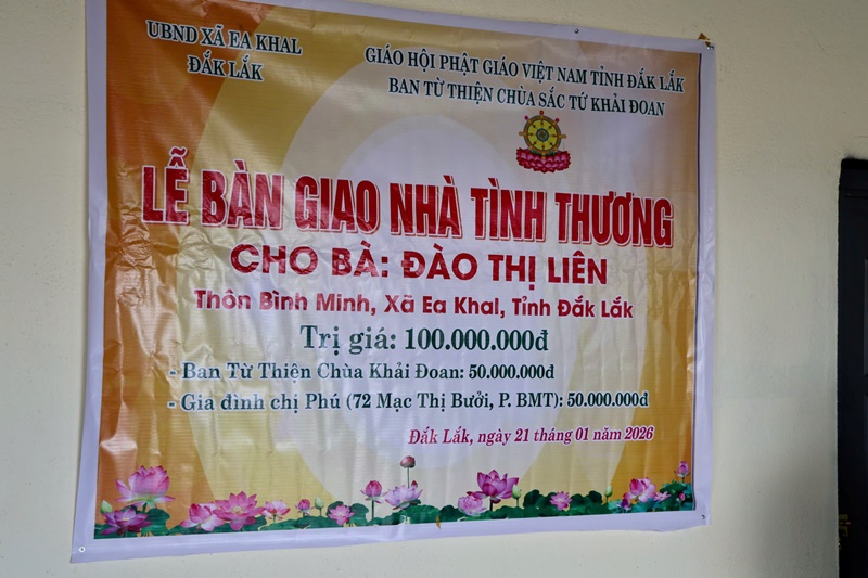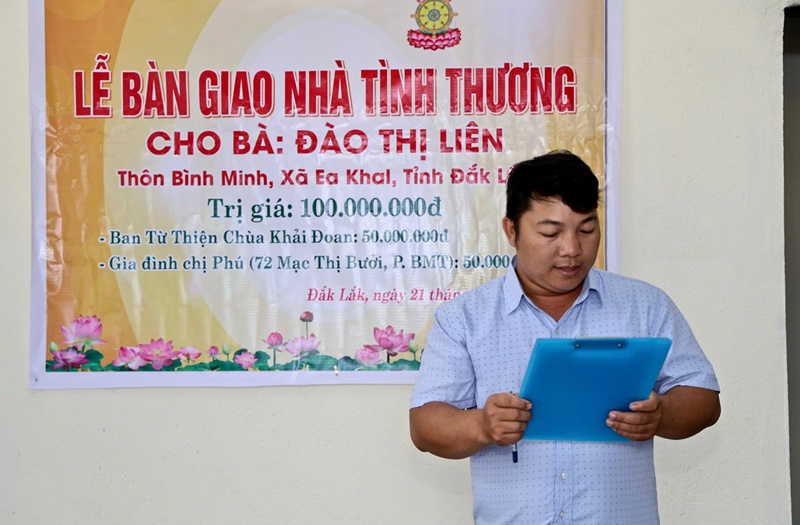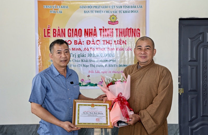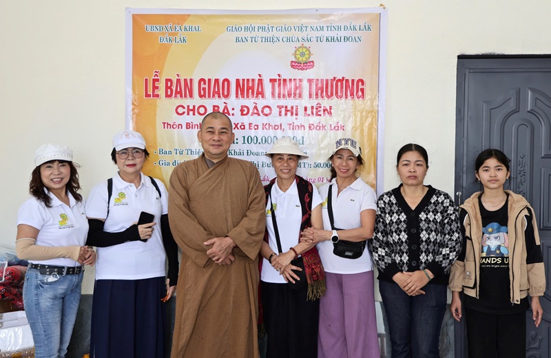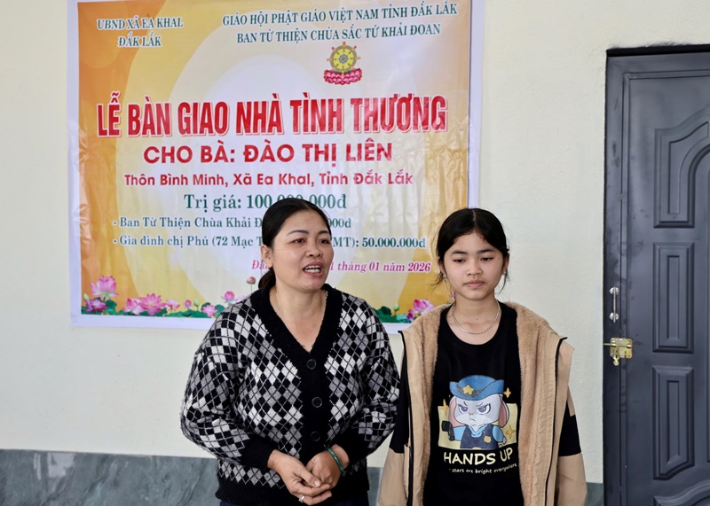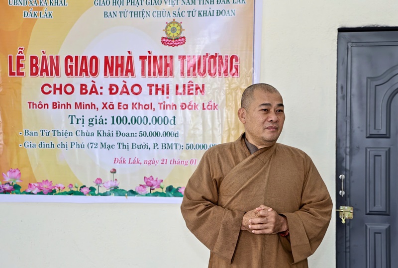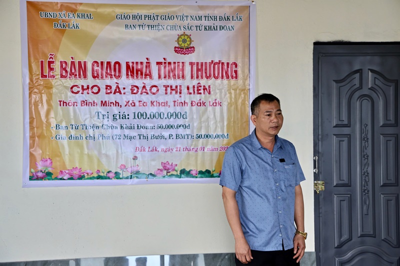 Đại diện chính quyền địa phương, ông Phạm Văn Thời - UV Ban Thường vụ Đảng ủy, Chủ tịch UBMTTQVN xã Ea Khal gởi lời cảm ơn Đại đức Minh Phương, Ban Từ thiện chùa Sắc tứ Khải Đoan đã ủng hộ xây dựng căn nhà. Ông cho biết gia đình bà Đào Thị Liên thuộc hộ cận nghèo, hoàn cảnh khó khăn, sinh sống trong căn nhà dựng tạm chật hẹp và xuống cấp nghiêm trọng nhưng không có điều kiện sửa chữa.