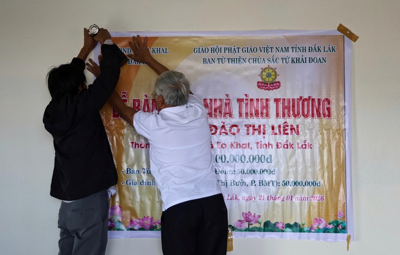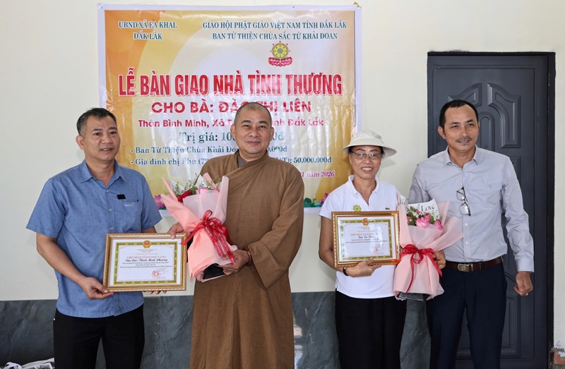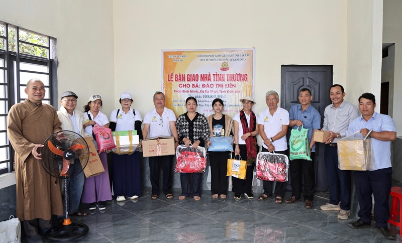 Dưới sự hướng dẫn của Đại đức Thích Minh Phương, Phó Thư ký - Chánh Văn phòng Ban Trị sự GHPGVN tỉnh Đắk Lắk, Ban Từ thiện chùa Sắc tứ Khải Đoan cùng gia đình chị Phú (72 Mạc Thị Bưởi, phường Buôn Ma Thuột), ủng hộ kinh phí 100.000.000đ xây dựng căn nhà với quy mô cấp 4, tường xây, mái lợp tôn, nền lát gạch men, đảm bảo thời gian sử dụng lâu dài.