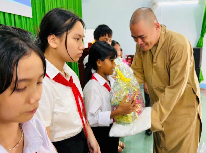 Đại đức Trưởng ban HDPT tỉnh đã gửi gắm lời căn dặn, chia sẻ với các em nhỏ: "Phần quà hôm nay là sự động viên, là nguồn năng lượng tích cực. Mong rằng các con sẽ cố gắng chăm ngoan học giỏi, vâng lời cha mẹ, thầy cô để sau này trở thành công dân có ích, là con ngoan trò giỏi, đóng góp xây dựng quê hương”.