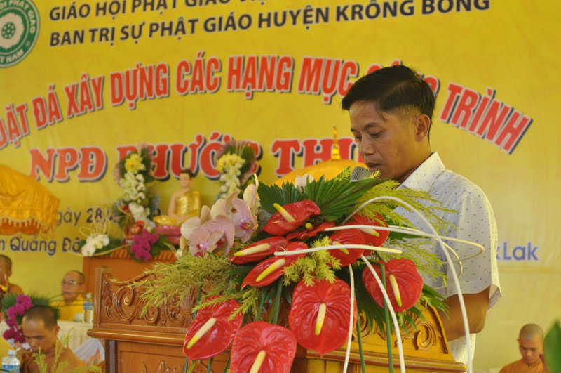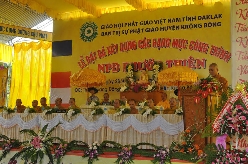 Đúng 8 giờ buổi lễ đặt đá xây dựng NPĐ Phước Thiện được chính thức diễn ra trong không khí trang nghiêm thanh tịnh theo nghi lễ Phật Giáo nhưng không kém phần phấn khởi của mỗi người con Phật dưới sự dẫn dắt chương trình của Đại Đức Thích Giác Đồng. Sau nghi lễ chào Quốc kỳ, Giáo kỳ, Tưởng niệm Bác Hồ kính yêu cùng các anh linh liệt sỹ là bài diễn văn khai mạc điểm lại sự hình thành và phát triển của NPĐ Phước Thiện trong những năm qua do Đại Đức Thích Giác Hiệp, Ủy viên BTS GHPGVN Tỉnh ĐakLak, Trưởng BTS GHPGVN Huyện Krông Bông, Trưởng Ban tổ chức lễ đặt đá xây dựng NPĐ Phước Thiện tuyên đọc. Tiếp đến là lời phát biểu của ông Hồ Quang Vũ, Phó chủ tịch UBND xã Hòa Sơn đại diện chính quyền địa phương chúc mừng, cũng như ghi nhận nhiều đóng góp của toàn thể bà con Phật tử đã cùng nhân dân trong toàn xã đã chung sức xây dựng đời sống khu dân cư, hưởng ứng tốt phong trào: “ Toàn dân đoàn kết xây dựng nông thôn mới, góp phần xây dựng thôn, buôn văn minh giàu đẹp và phát triên” đồng thời nhắc nhở: “ BTS GHPGVN Huyện, Ban hộ tự NPĐ Phước Thiện, chủ đầu tư xây dựng, các đơn vị thi công, thiết kế, tư vấn giám sát tuân thủ các quy định về trình tự thủ tục, đầu tư xây dựng, các tiêu chuẩn, quy trình kỷ thuật để triển khai thi công công trình đúng tiến độ, đảm bảo chất lượng, đảm bảo an toàn lao động và vệ sinh môi trường nhằm hạn chế mức thấp nhất ảnh hưởng công trình đến môi trường, đến đời sống sinh hoạt của người dân trong khu vực”. Sau lời phát biểu đại diện chính quyền địa phương là lời huấn từ của Hòa Thượng Thích Châu Quang ,Ủy viên Hội đồng trị sự trung ương GHPGVN, Trưởng BTS GHPGVN Tỉnh ĐakLak chứng minh đại lễ tri ân chính quyền địa phương các cấp đã đồng ý và tạo điều kiện thuận lợi để NPĐ Phước Thiện hình thành và phát triển ,đến nay được đặt viên đá đầu tiên xây dựng ngôi Chùa với hy vọng một ngày không xa tại đây sẽ có một ngôi Chùa trang nghiêm thanh tịnh đúng bản sắc văn hóa dân tộc, đồng thời khuyến khích bà con Phật tử xa gần cùng chung tay, phát tâm hỷ cúng để ngôi Tam Bảo sớm được thành tựu.