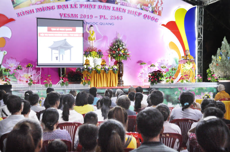TT. Thích Giác Tiến tuyên đọc thông điệp Đức Pháp chủ GHPGVN Trưởng lão Hòa thượng Thích Phổ Tuệ - gửi Tăng Ni, Phật tử ở trong nước và ở nước ngoài nhân Đại lễ Phật đản – PL 2563 – DL 2019 Ngài nói: “Năm nay, hòa trong không khí hân hoan của cộng đồng Phật giáo trên toàn thế giới kỷ niệm ngày Vesak trọng đại, Giáo hội Phật giáo Việt Nam vô cùng vinh dự là nước chủ nhà đăng cai tổ chức Đại lễ Vesak Liên hợp quốc lần thứ 16, PL. 2563 – DL. 2019. Thay mặt Hội đồng Chứng minh, Hội đồngTrị sự, và toàn thể Tăng Ni, Phật tử Việt Nam, tôi hoan nghênh và nhiệt liệt chào mừng Chư tôn đứclãnh đạo các Giáo hội Tăng già, các tổ chức hệ phái truyền thừa Phật giáo từ khắp các Châu lục đã hội tụ về Việt Nam lần thứ 3 kỷ niệm ngày Vesak Liên hợp quốc. Đây là cơ hội quý báu để chúng tacùng nhau tăng trưởng niềm tin vào chân lý giải thoát, phát huy giá trị những di sản mà Đức Thế tônđã để lại cho nhân loại chúng ta trong hệ thống tư tưởng giáo lý vô giá về trí tuệ, lòng từ bi, triết lý vô ngã, tinh thần bất bạo động, những giá trị hòa bình và phát triển bền vững.”