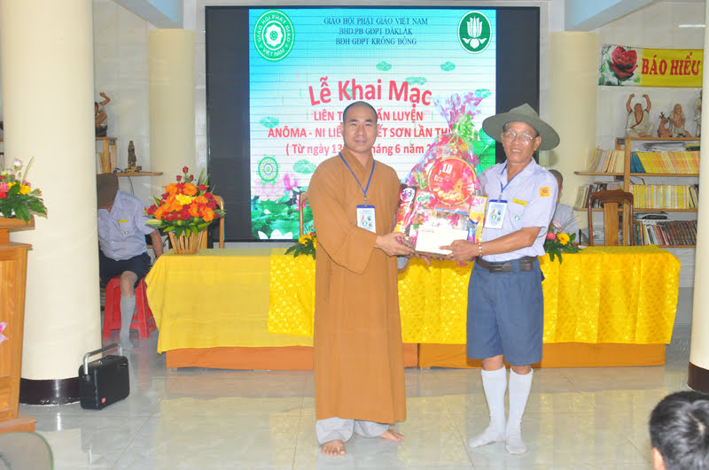 Lễ khai mạc liên trại huấn luyện đội chúng trưởng, đầu thứ đàn GĐPT Huyện KrôngBông lần thứ IX diễn ra và thành công viên mãn theo đúng nghi thức của tổ chức GĐPTVN trên tinh thần đoàn kết thắm đượm tình yêu thương của Chư tôn đức Tăng, Ni đồng thời được nhận hoa, quà chúc mừng hội trại và những lời dạy quý báu của chư tôn đức chứng minh trao tặng. Sau lễ khai mạc trại toàn thể Huynh trưởng và trại sinh hạnh phúc được chụp hình lưu niệm cùng quý chư tôn đức và đại biểu đồng thời được nghe bài pháp chủ đề “Tam quy, ngũ giới” do Đại Đức Thích Giác Hiền,Ủy viên hoằng pháp BTS GHPGVN Tỉnh ĐakLak,Trưởng ban hoằng pháp BTS GHPGVN Huyện Krông Bông ,Trụ trì Chùa Phước Vân thuyết giảng giúp cho trại sinh thấu hiểu sâu hơn giáo lý Phật đà để làm hành trang cho việc rèn luyện,tinh tấn hơn trên con đường tu học đúng chánh pháp.