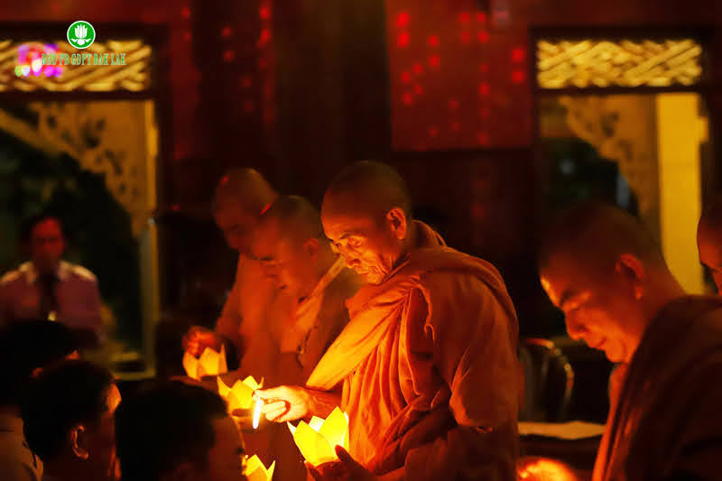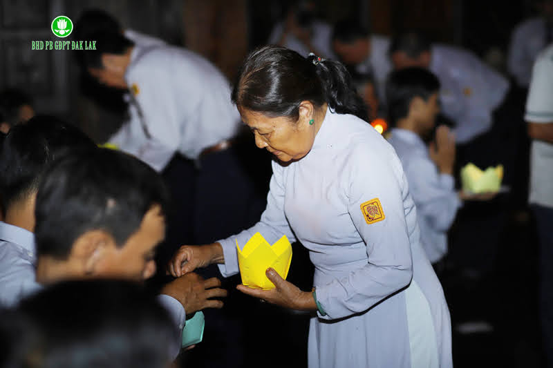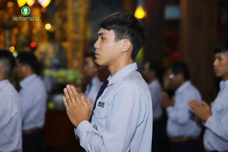 Đúng 20 giờ, trong không khí trang nghiêm thanh tịnh tại chánh điện Chùa Phổ Minh, ba hồi chuông trống bát nhã vang vọng cung đón từng bước chân thanh thoát nhẹ nhàng, an lạc hành thiền của quý chư Tôn đức giáo phẩm trong BTS – GHPGVN Tỉnh Đaklak quang lâm chứng minh buổi lễ và chú nguyện, truyền tâm đăng, trao cấp hiệu cho các tân Huynh trưởng thọ nhận cấp.