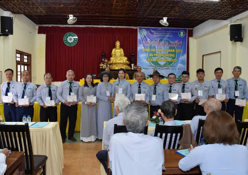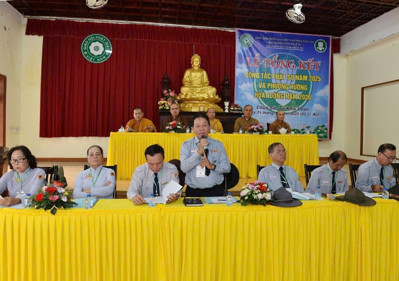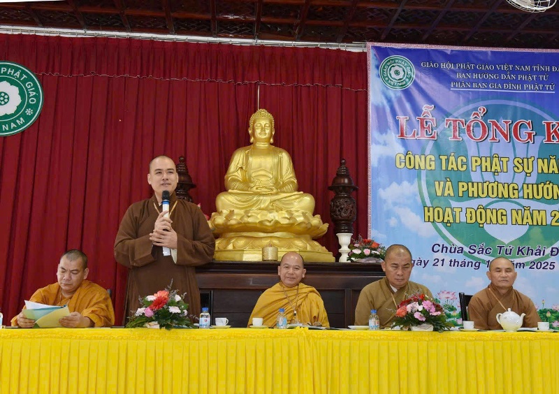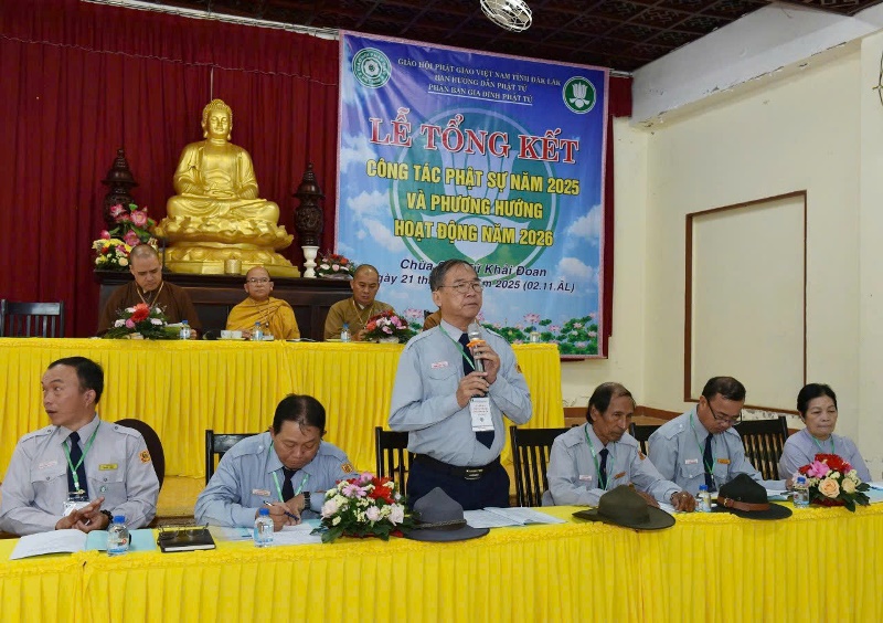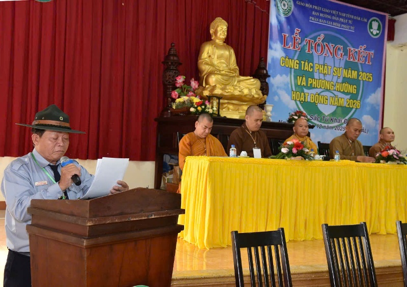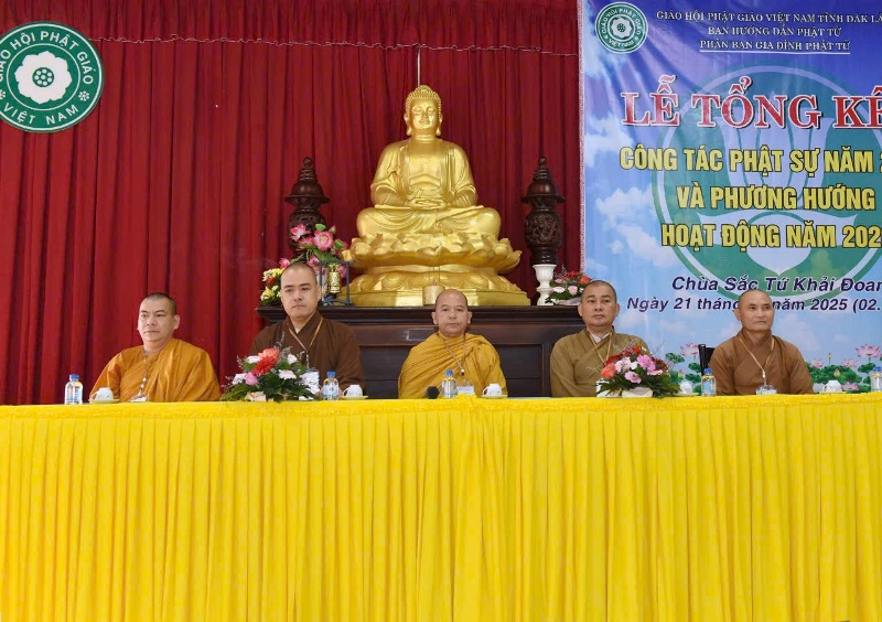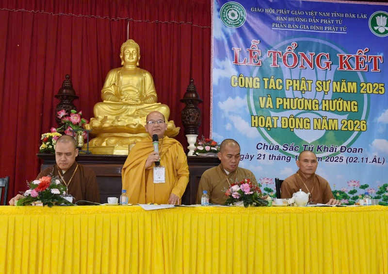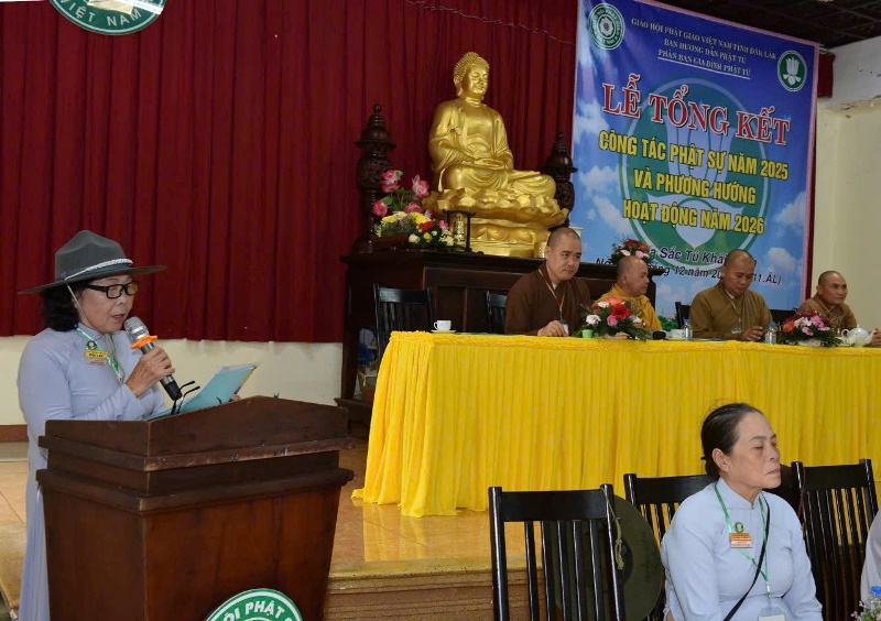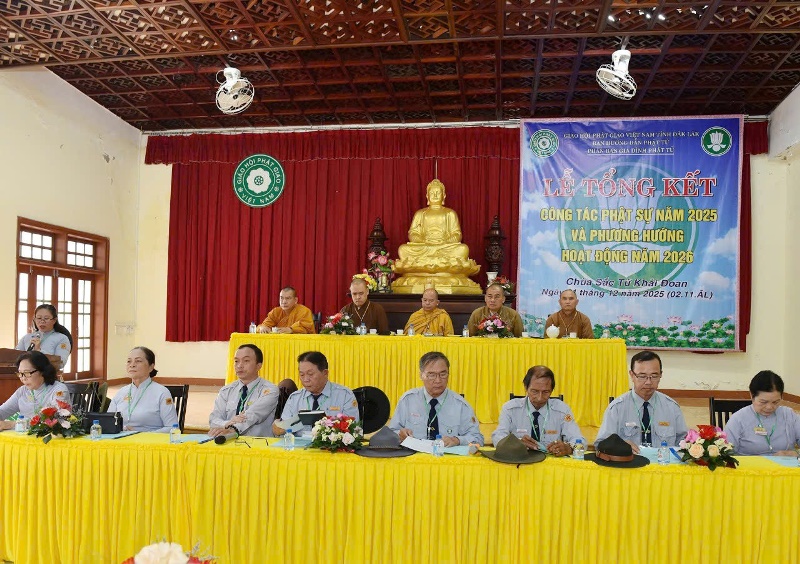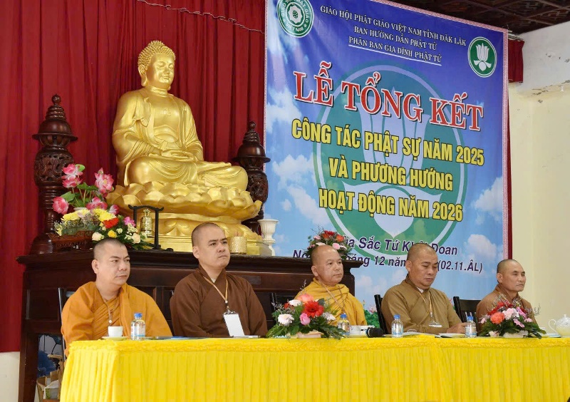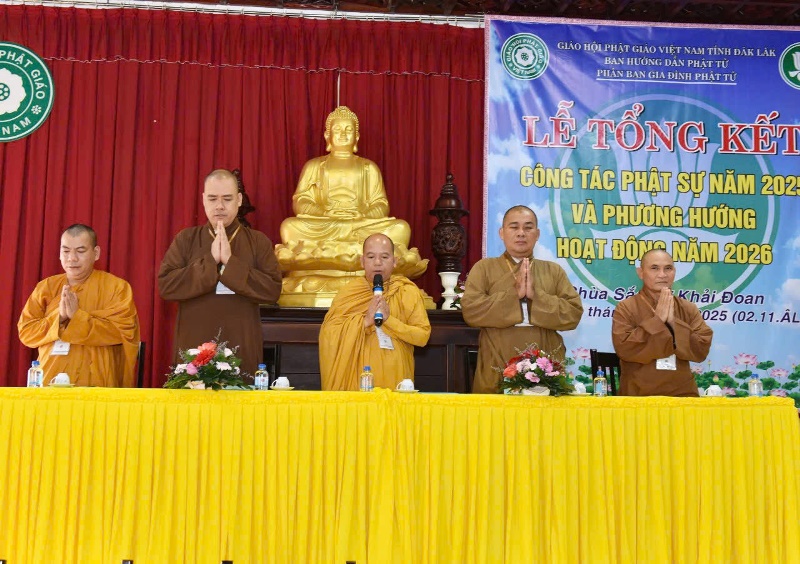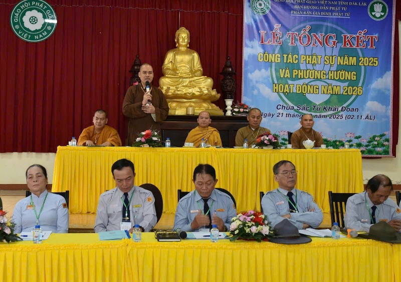 Sáng Chủ nhật ngày 21/12/2025 (02/11/ Ất Tỵ), tại hội trường Chùa Sắc tứ Khải Đoan, phường Buôn Ma Thuột, tỉnh Đắk Lắk, Phân Ban Gia Đình Phật Tử tỉnh Đắk Lắk đã long trọng tổ chức Hội nghị Tổng kết công tác Phật sự năm 2025 và triển khai phương hướng hoạt động năm 2026.Quang lâm chứng minh và tham dự hội nghị có TT. Thích Giác Phổ - Phó Trưởng Ban Thường trực Ban Trị Sự GHPGVN tỉnh Đắk Lắk; ĐĐ. Thích Minh Phương – Phó Thư ký, Chánh văn phòng GHPGVN tỉnh; ĐĐ. Thích Hải Nguyện - Ủy viên Thường trực BTS, Trưởng Ban Hướng Dẫn Phật Tử tỉnh, cùng chư tôn đức Tăng, Ni BHDPT tỉnh.