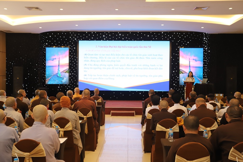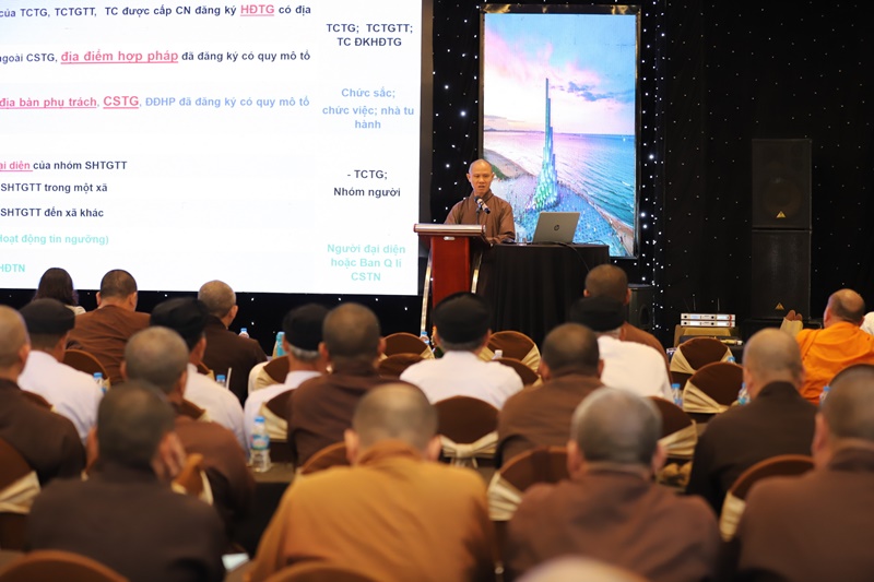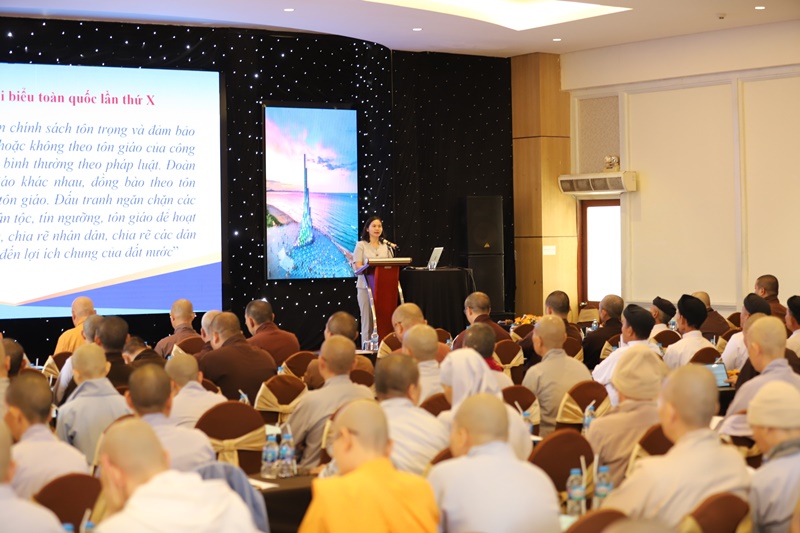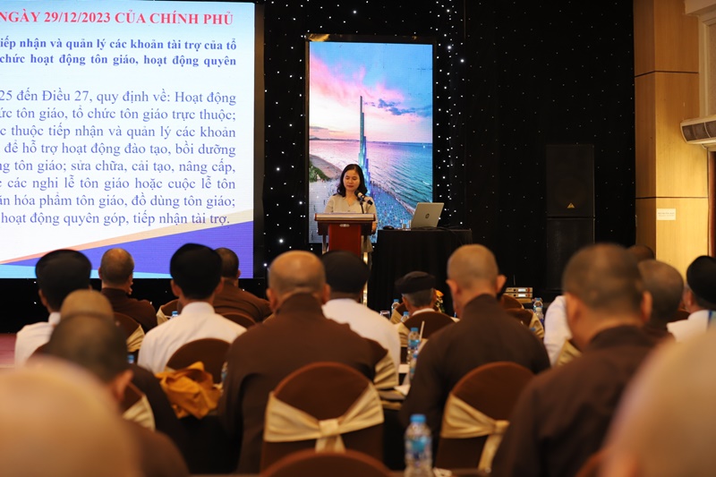 Tại Hội nghị, bà Phó Giám đốc sở Dân tộc và Tôn giáo triển khai các quy định pháp luật liên quan đến Luật Tín ngưỡng, tôn giáo cụ thể như: