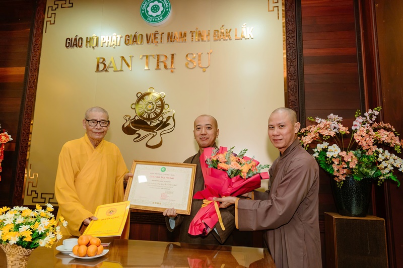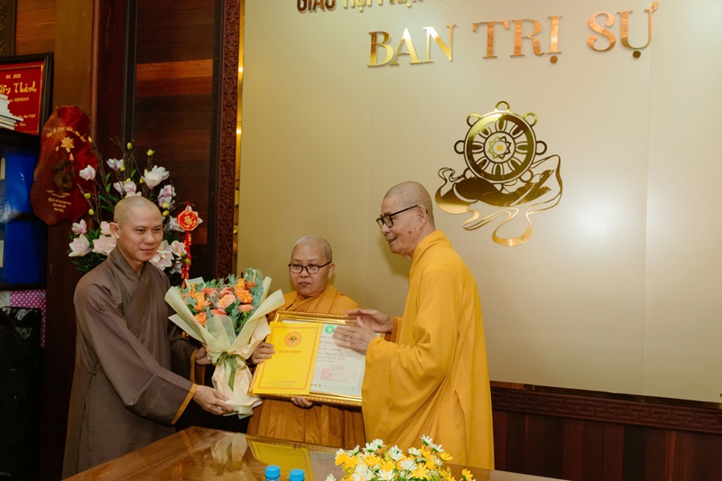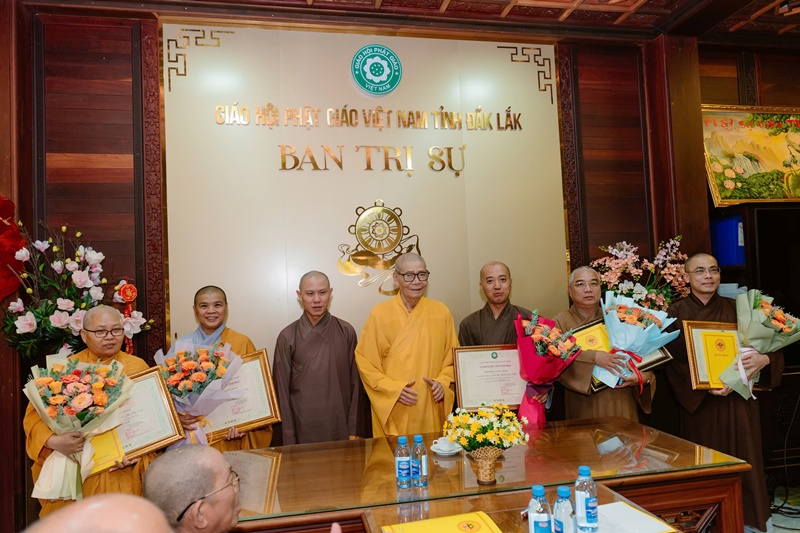 Dịp này, Thường trực BTS cũng tổ chức trao Giáo chỉ tấn phong Giáo phẩm đến chư tôn đức Tăng Ni tỉnh nhà được Giáo Hội tấn phong ngày 30/12/2025. Theo đó, Giáo phẩm Thượng tọa 7 vị, Ni trưởng 1 vị, Ni sư 10 vị. Hòa thượng Thích Châu Quang, UV HĐTS, Chứng minh BTS PG tỉnh đã quang lâm trao Giáo chỉ tấn phong cho quý tôn đức trong niềm hoan hỷ của toàn thể đại chúng.