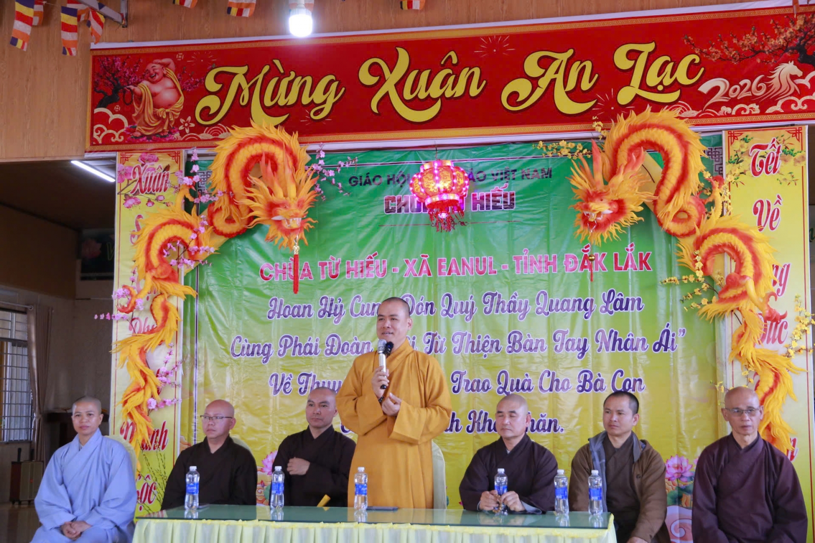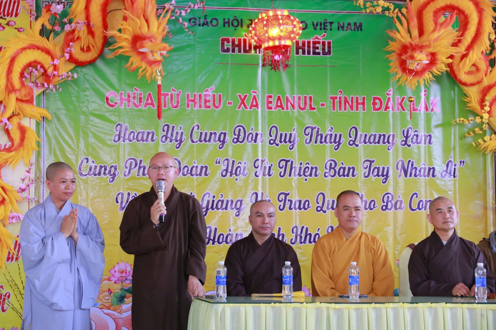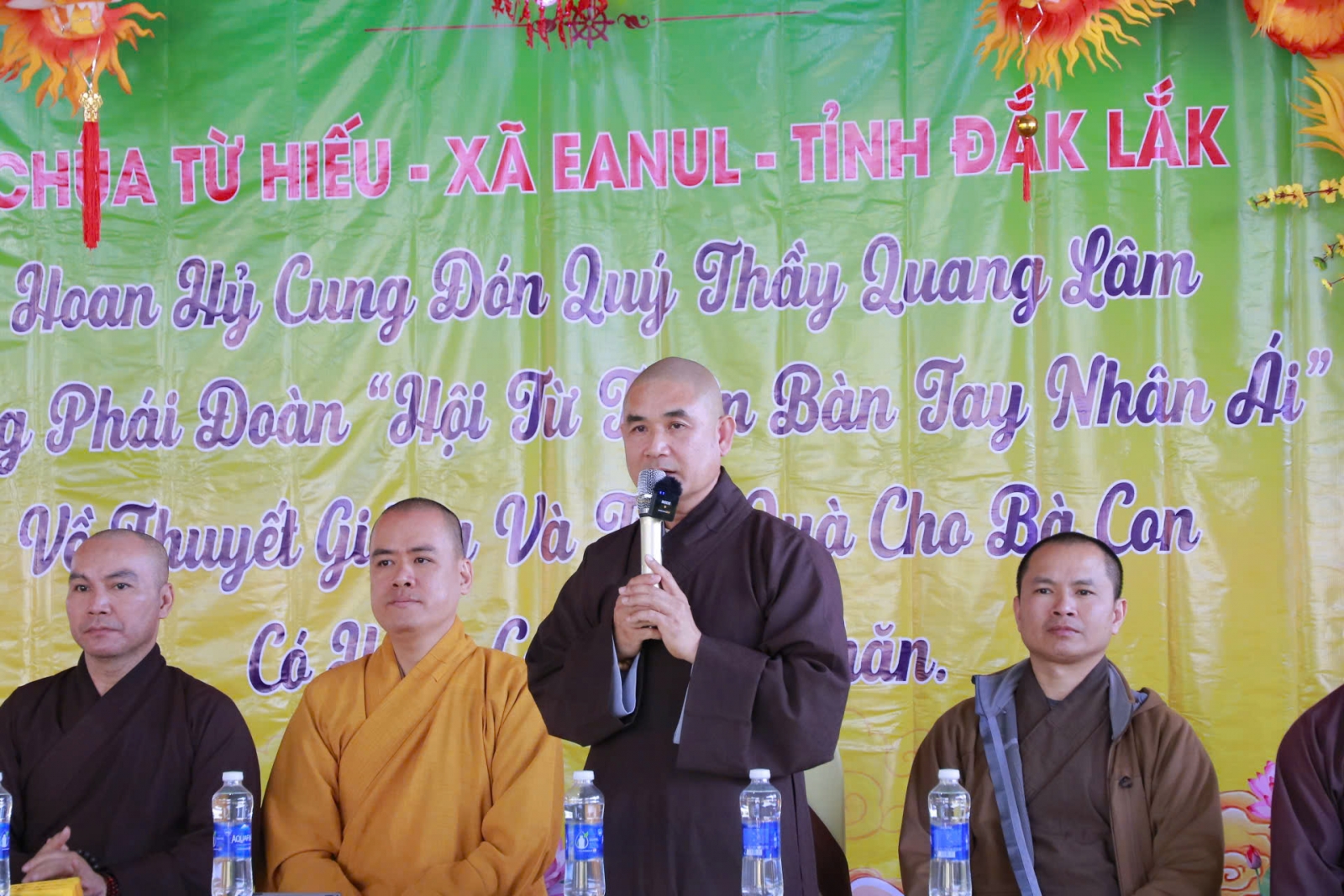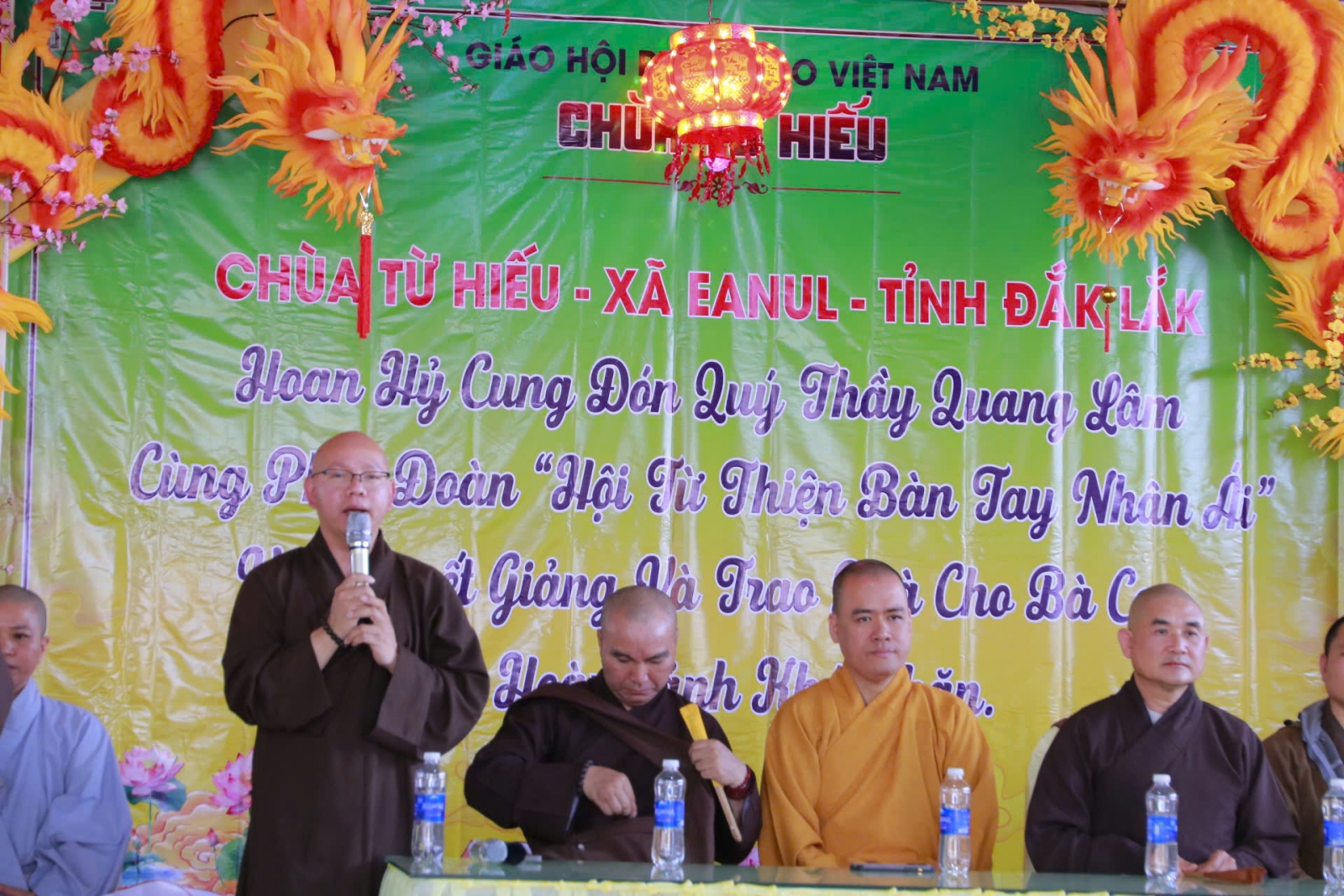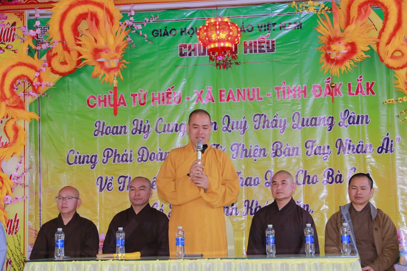 Phát biểu tại buổi trao quà, Đại đức Thích Hải Nguyện gửi lời tri ân sâu sắc đến Thượng tọa Hội trưởng, chư Tăng Ni cùng toàn thể quý mạnh thường quân trong và ngoài nước. Đại đức nhấn mạnh, việc không quản ngại đường sá xa xôi, trở về vùng sâu vùng xa để chia sẻ yêu thương, hỗ trợ bà con nghèo, đặc biệt là đồng bào dân tộc thiểu số, đã thể hiện tinh thần nhập thế của Phật giáo, đồng hành cùng dân tộc trong công tác an sinh xã hội.