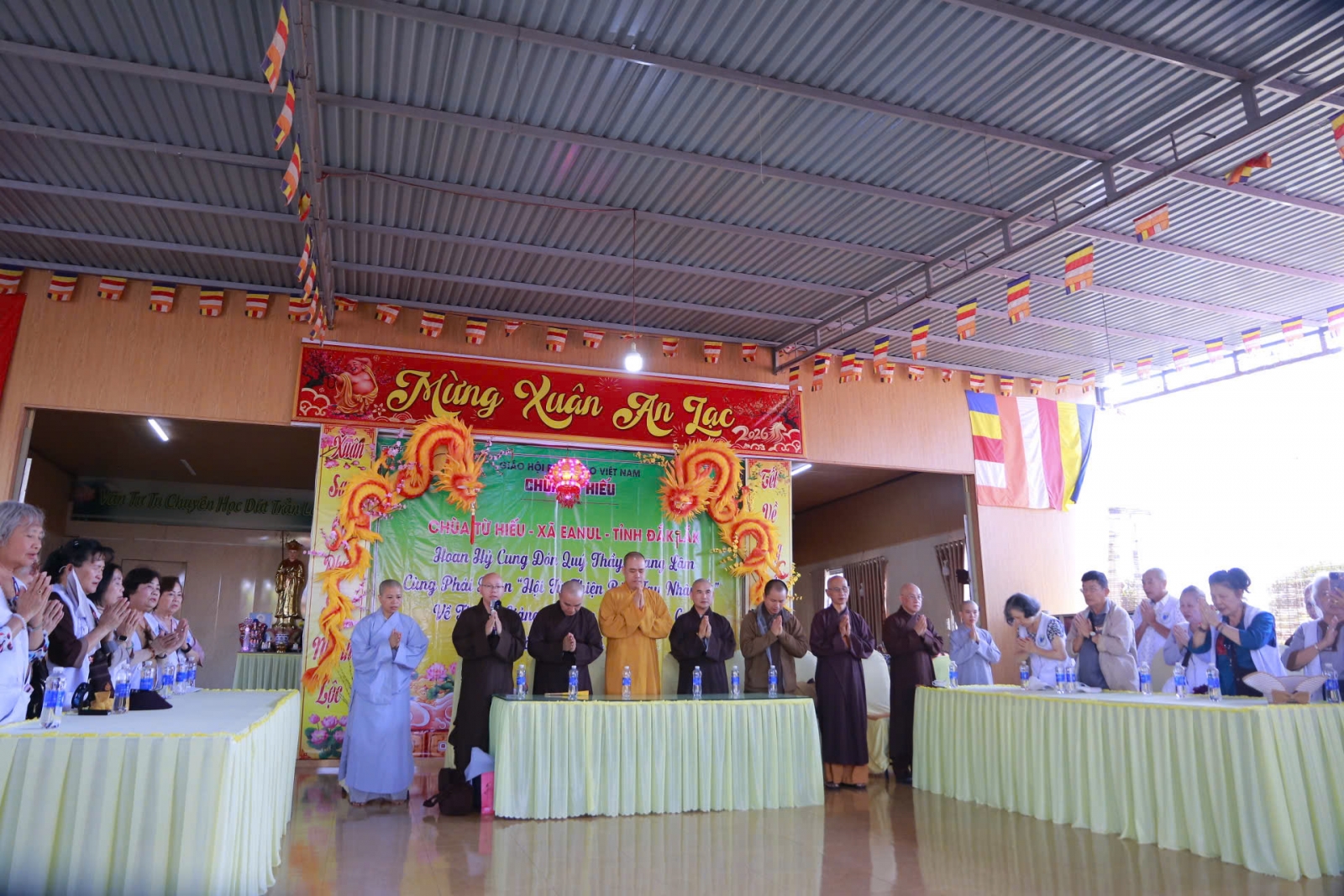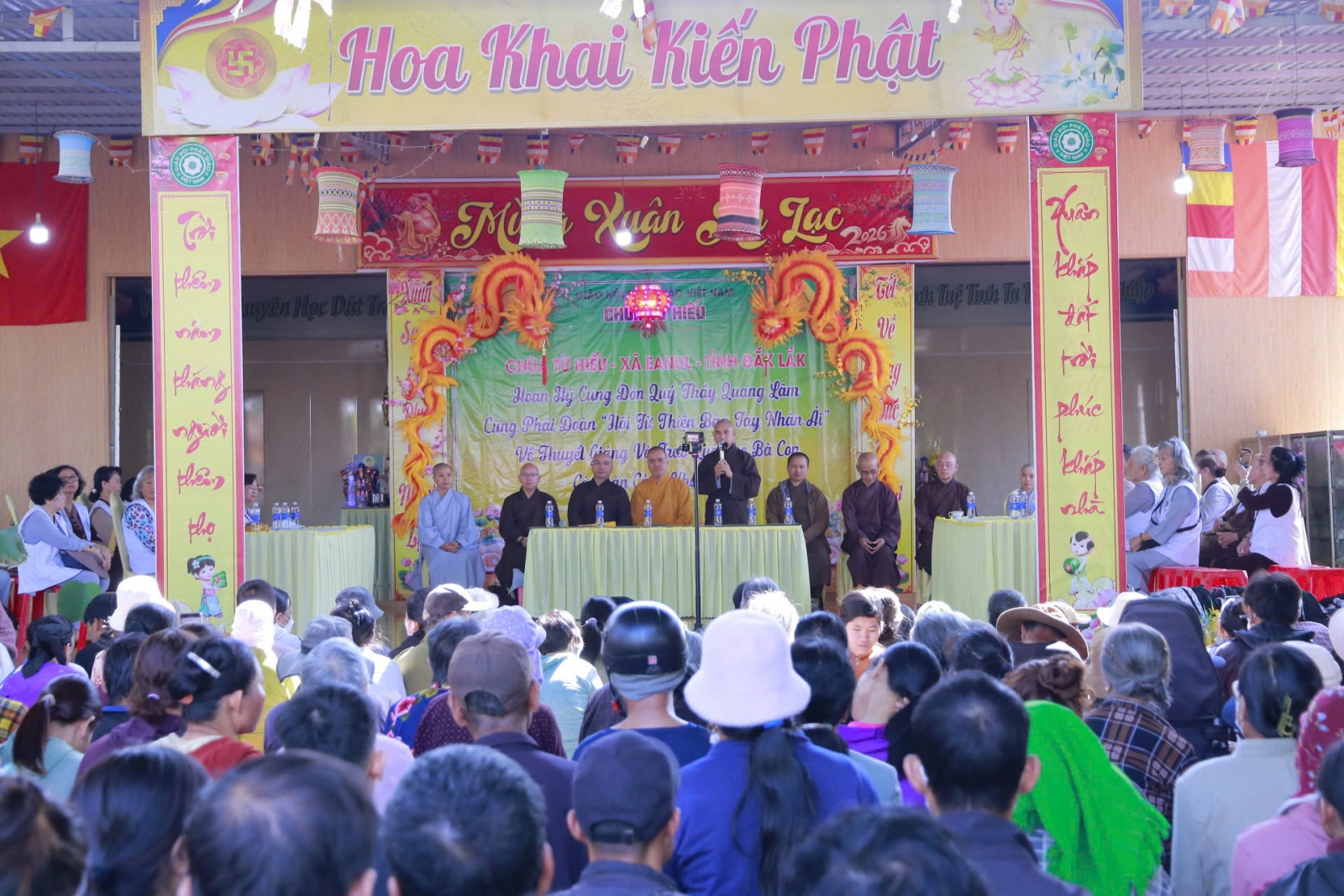 Trong không khí ấm áp nghĩa tình, sáng ngày 17/3/2026 (nhằm ngày 29/Giêng/Bính Ngọ), tại chùa Từ Hiếu, thôn 3, xã Ea Nuôl, hội từ thiện “Bàn Tay Nhân Ái” do bà Phạm Ngọc Mỹ (phường Phan Thiết, tỉnh Lâm Đồng) làm trưởng đoàn, đã đến thăm và trao tặng những phần quà ý nghĩa cho bà con có hoàn cảnh khó khăn trên địa bàn xã. Trang nghiêm tiếp đón đoàn có Sư cô trụ trì Thích Nữ Thánh Đạo cùng đạo tràng Phật tử chùa Từ Hiếu và đông đảo bà con nhân dân địa phương. Quang lâm chứng minh và tham dự buổi trao quà có Đại đức Thích Hải Nguyện - Trưởng ban Hướng dẫn Phật tử tỉnh Đắk Lắk; Thượng tọa Thích Minh Nhật - Hội trưởng hội từ thiện; cùng chư Tăng Ni tháp tùng đoàn từ Hoa Kỳ.