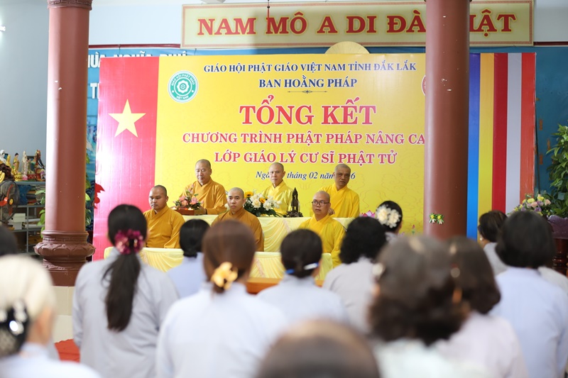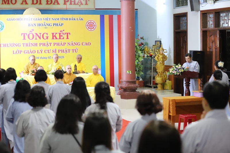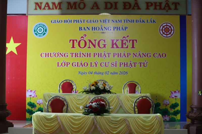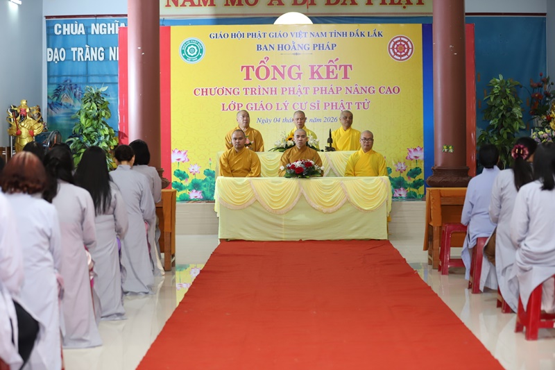 Chiều ngày 04/02/2026 (nhằm 17/12 Ất Tỵ), tại chùa Nghĩa Phú (khu phố Đông Phước, P.Tuy Hòa, tỉnh Đắk Lắk), Ban Hoằng pháp GHPGVN tỉnh Đắk Lắk long trọng tổ chức lễ tổng kết lớp Giáo lý Phật pháp nâng cao, khép lại chặng đường tu học chuyên sâu kéo dài 2 năm của hơn 50 học viên Phật tử.Quang lâm chứng minh và tham dự buổi lễ có: Thượng toạ Thích Nguyên Minh, Ủy viên Hội đồng Trị sự, Trưởng Ban Trị sự GHPGVN tỉnh Đắk Lắk; Thượng tọa Thích Quảng Huy, Trưởng Ban Hoằng pháp GHPGVN tỉnh - Chủ nhiệm lớp giáo lý; Thượng tọa Thích Nguyên Tân, Đại đức Thích Quảng Hội - đồng Phó Trưởng Ban Hoằng pháp tỉnh; Đại đức Thích Thánh Dự - Thư ký Ban Hoằng pháp tỉnh, cùng chư Tôn đức trong Ban Giáo thọ sư.