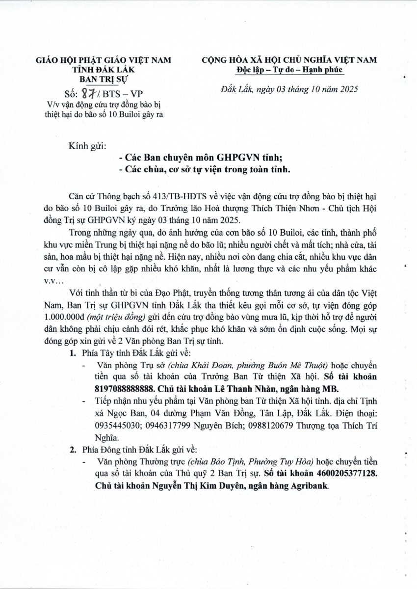Do ảnh hưởng của bão số 10 Builoi, các tỉnh thành phố khu vực miền Trung bị thiệt hại nặng nề. Với tinh thần từ bi của Đạo Phật, truyền thống tương thân tương ái của dân tộc Việt Nam, Ban Trị sự GHPGVN tỉnh Đắk Lắk kêu gọi các cơ sở tự viện đóng góp 1.000.000đ (một triệu đồng) gửi đến cứu trợ đồng bào vùng mưa lũ, khắc phục khó khăn, sớm ổn định cuộc sống.