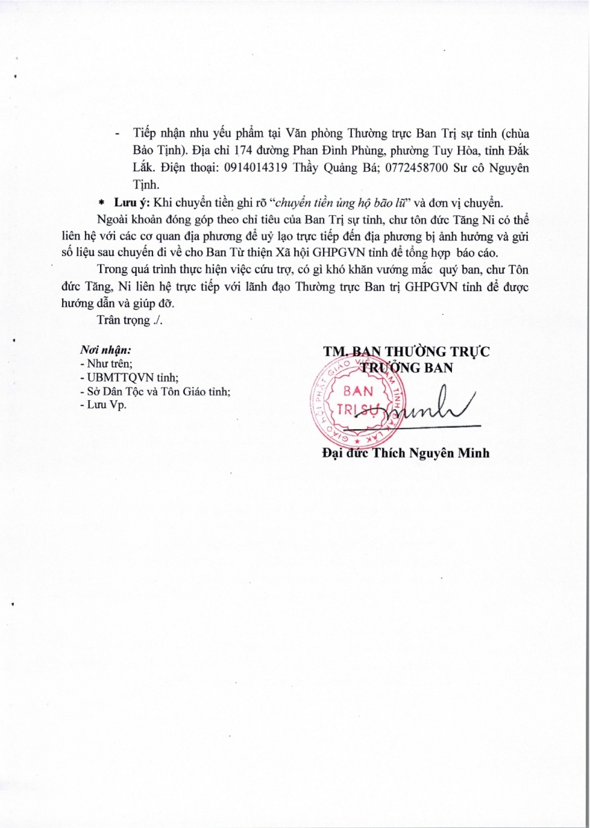 Ngoài sự đóng góp theo chỉ tiêu của BTS tỉnh, chư tôn đức Tăng Ni có thể liên hệ với các cơ quan địa phương để ủy lạo trực tiếp đến địa phương bị ảnh hưởng và gửi số liệu sau chuyến đi về cho Ban Từ thiện Xã hội GHPGVN tỉnh để tổng hợp báo cáo.