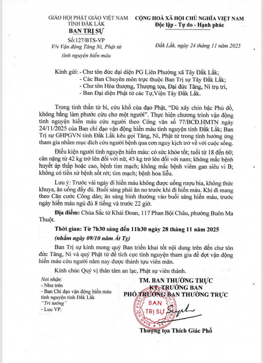 Theo chủ trương của Ban Trị sự GHPGVN tỉnh Đắk Lắk, chương trình hiến máu tình nguyện dành cho Tăng Ni và Phật tử toàn tỉnh sẽ diễn ra vào sáng ngày 28/11/2025 tại chùa Sắc tứ Khải Đoan, P.Buôn Ma Thuột.Nhằm phát huy tinh thần từ bi cứu khổ của đạo Phật, Ban Trị sự GHPGVN tỉnh Đắk Lắk vừa có công văn kêu gọi Tăng Ni, Phật tử tích cực tham gia hiến máu nhân đạo, lan tỏa hành động cao đẹp cứu người lúc nguy kịch.