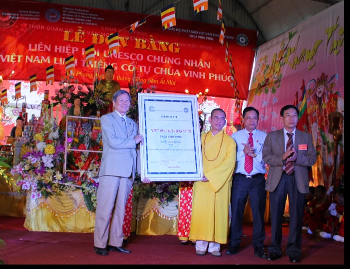 Vừa qua, ngày 01-3-2015 (11-Giêng Ất Mùi), niềm vinh dự đã đến với Vinh Phúc. Chùa Vinh Phúc, thôn Quan Độ, xã Văn Môn (Yên Phong-Bắc Ninh), đã tổ chức Lễ đón bằng “Việt Nam Linh thiêng Cổ tự chùa Vinh Phúc” do UNESCO chứng nhận.